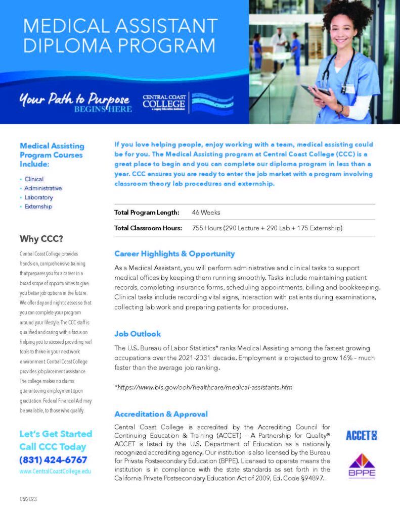 The Medical Assisting program is a great way to enter the healthcare industry. At Central Coast College, we offer a choice of 3 different schedules – morning, afternoon and evening. And you can get trained in 3-4 hours a day and complete your program in less than a year.