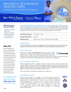 The Magnetic Resonance Imaging (MRI) Associate of Applied Science Program at Central Coast College (CCC) is a great way to get trained. Our program prepares you for an MRI career with a program involving classroom theory, lab procedures, externship and online learning for general education requirements.